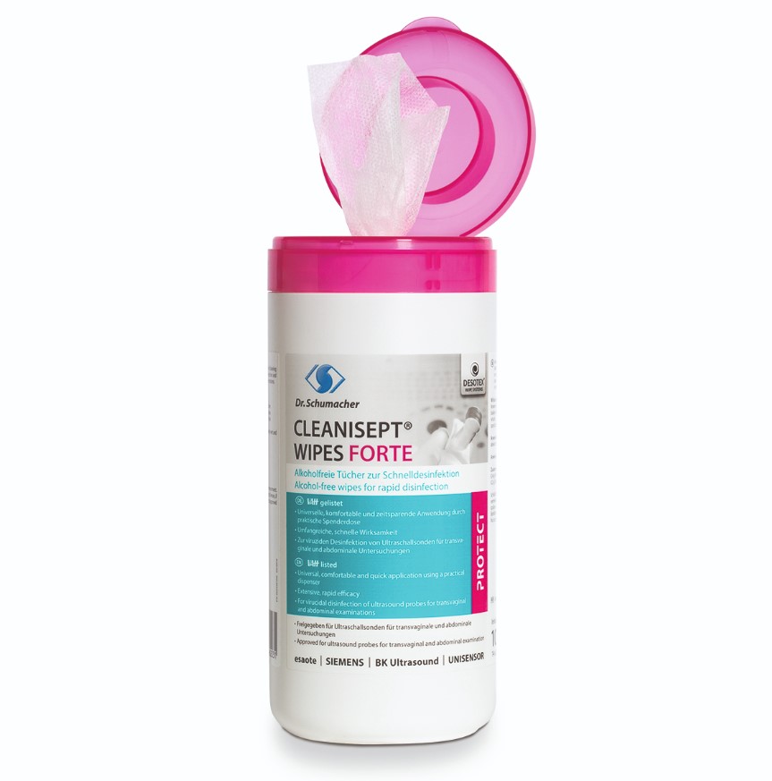 CLEANISEPT WIPES FORTE sind alkoholfreie, gebrauchsfertige Desinfektionstücher zur viruziden Desinfektion und Reinigung von Medizinprodukten und medizinischem Inventar. CLEANISEPT WIPES FORTE ermöglichen insbesondere bei der Desinfektion und Reinigung von Ultraschallköpfen für transvaginale und transrektale Untersuchungen eine praxisnahe und zeitsparende Anwendung. Sie sind alkoholfrei und enthalten weder Aldehyde noch Phenole. Die Tücher lassen sich einzeln aus der praktischen und wiederverschließbaren Spenderdose entnehmen. CLEANISEPT WIPES FORTE basieren auf einer anwenderfreundlichen Zusammensetzung. Trotz der umfangreichen und schnellen Wirksamkeit, übergreifend innerhalb 2 Minuten, ist das Produkt geruchlos und weist eine sehr gute Materialverträglichkeit auf.