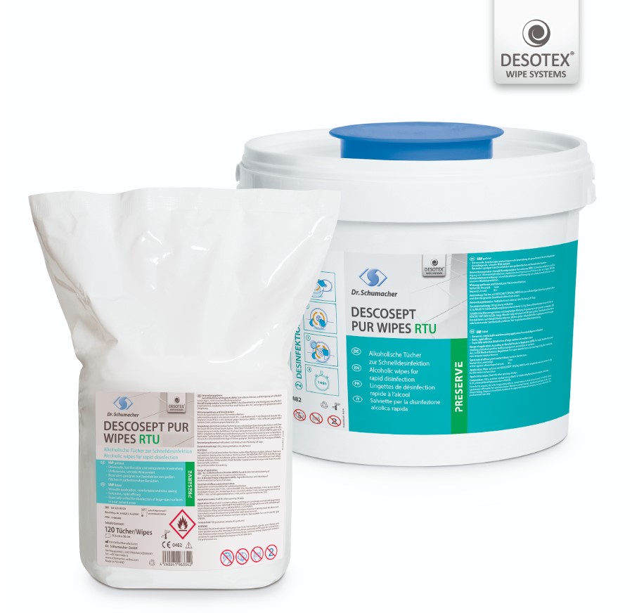 DESCOSEPT PUR WIPES RTU sind alkoholische, gebrauchsfertige Tücher zur Desinfektion und Reinigung von Medizinprodukten und medizinischem Inventar sowie Flächen in patientennahen Bereichen. DESCOSEPT PUR WIPES RTU bieten bei der Desinfektion und Reinigung von großen Flächen eine universelle und zeitsparende Anwendung. Die Tücher lassen sich einzeln aus dem