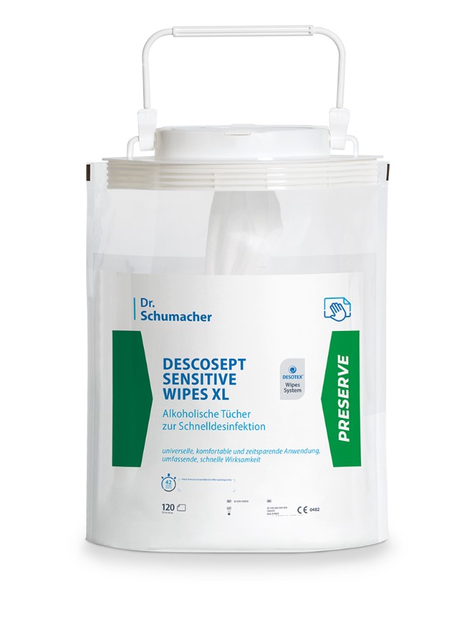 DESCOSEPT SENSITIVE WIPES XL sind alkoholische, gebrauchsfertige Tücher zur materialschonenden Desinfektion und Reinigung von Medizinprodukten und medizinischem Inventar und Flächen aller Art in patientennahen Bereichen. DESCOSEPT SENSITIVE WIPES XL bieten bei der Desinfektion und Reinigung von mittelgroßen Flächen eine universelle und zeitsparende Anwendung. Die Tücher lassen sich einzeln aus der praktischen Packung mit wiederverschließbarem Deckel entnehmen. DESCOSEPT SENSITIVE WIPES XL basieren auf einer optimal aufeinander abgestimmten Kombination von Tuchmaterial und Tränkflüssigkeit. Dadurch ist eine wirksame Desinfektion innerhalb kürzester Zeit möglich, wobei auch empfindliche Flächen und Materialien schonend behandelt werden.