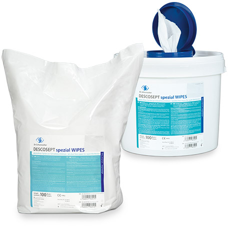 DESCOSEPT SPEZIAL WIPES sind alkoholfreie, gebrauchsfertige Tücher zur schnellen Desinfektion und Reinigung von Medizinprodukten und medizinischem Inventar sowie Flächen aller Art im Bereich der Routine. DESCOSEPT SPEZIAL WIPES bieten bei der Desinfektion und Reinigung von großen Flächen eine universelle und zeitsparende Anwendung. Die Tücher lassen sich einzeln aus dem gewohnten Vliestuchspender mit wiederverschließbarem Deckel entnehmen. Jedem Nachfüllpack liegen die DESOTEX AUFBEREITUNGSTÜCHER bei, die eine manuelle, hygienische Aufbereitung vor Wiederbefüllung des Vliestuchspenders ermöglichen.