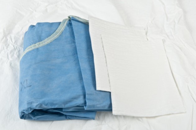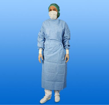 Ein modern konzipierter mit guten Trageeigenschaften ausgestatteter Einweg-Operationsmantel nach DIN EN 13795 für die Leistungsstufe "Standard".