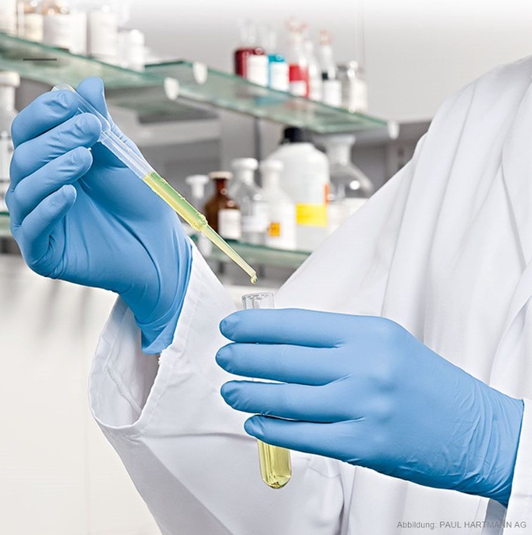Latexfreie silikonfreie blau gefärbte Einmal-Untersuchungs- und Schutzhandschuhe aus weichem Nitrilkautschuk, puderfrei. Paarweise, steril und ozongeschützt eingesiegelt.