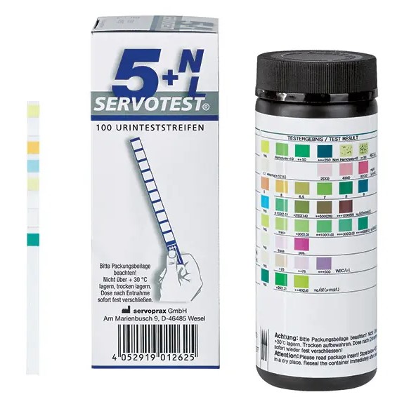 Servotest 5NL 100 Teststreifen - pH, Gluc, Ascorb, Nitrit, EW, Urobili, Blut, Leuco