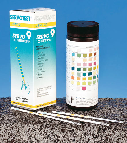 Servotest 9, 100 St. Ph,Gluc.,Keton,Nitrit,EW,Bili Uro.,Blut, spez. Gewicht