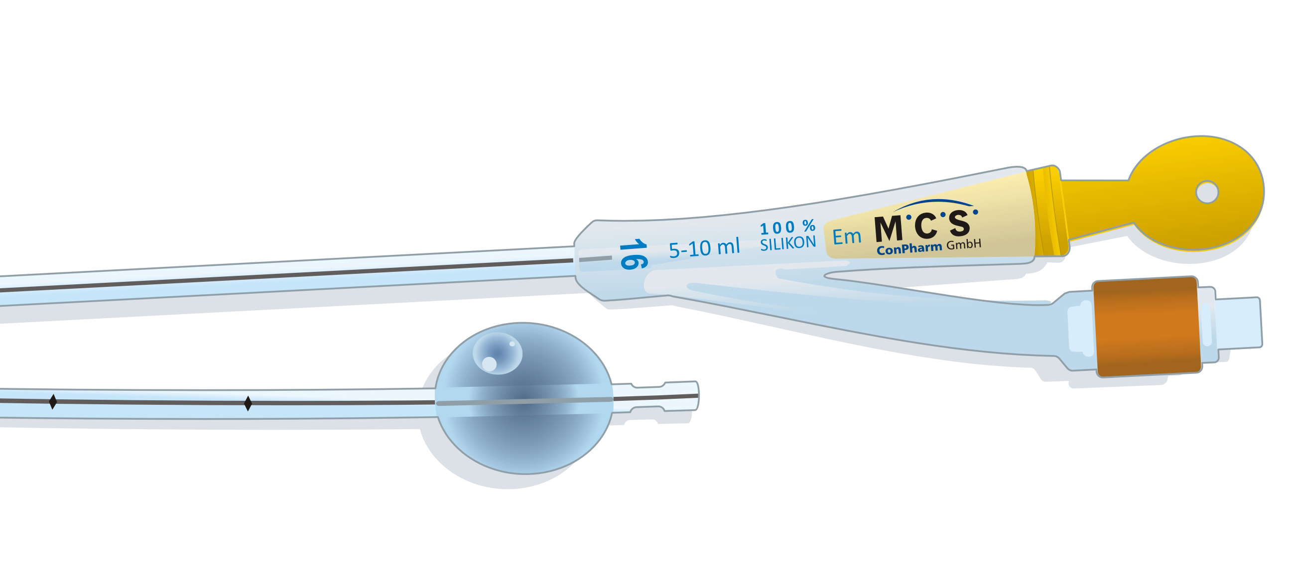 - Der endoffene zwei-lumige Vollsilikonkatheter leitet den Urin