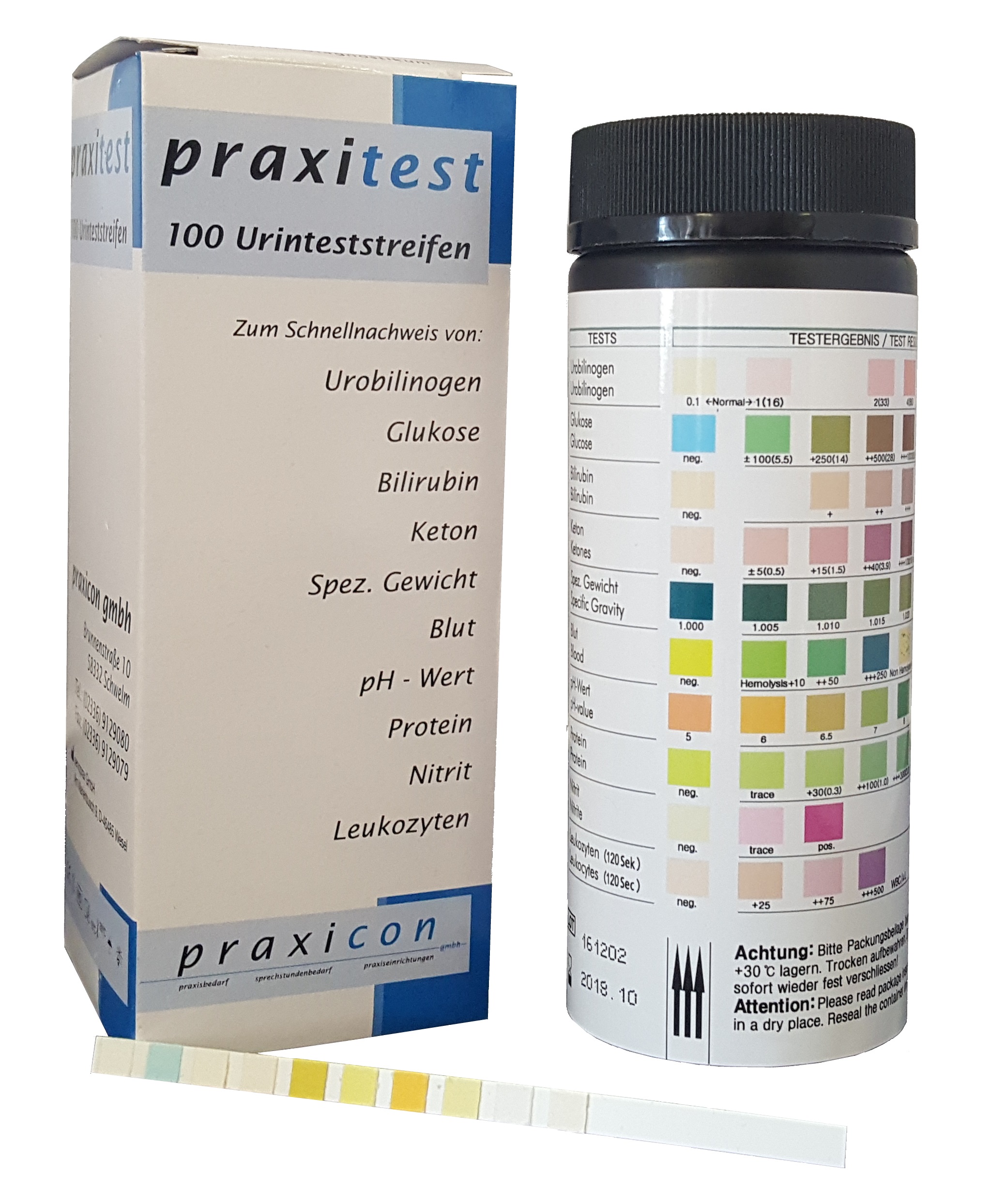 Produktinformationen "praxitest 10, 100 Urinteste Ph,Gluc.,Keton,Nitrit,EW,Bili Uro.,Blut,Leuco,spez.Gewicht"